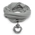 Sciarpa gioiello ciondolo mezzaluna e placca tonda. Colore grigio chiaro. Altezza ciondolo 7 cm circa. Tessuto in jersey. Realizzato a mano in alluminio 100% riciclato. Nickel tested. Lavorazione artigianale. Le misure indicate possono essere soggette a piccole variazioni date dall'artigianalità del prodotto.