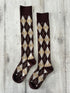 Calze lunghe in cotone con fantasia a rombi nei toni del marrone, beige e bianco. Il classico motivo argyle dona un’eleganza senza tempo, perfetta per look casual o preppy. Realizzate in morbido cotone elasticizzato, offrono una vestibilità comoda e traspirante per tutto il giorno. Ideali da abbinare con gonne, stivali o pantaloni cropped, queste calze lunghe aggiungono un tocco raffinato e vintage al tuo outfit quotidiano.