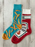 Un’accoppiata irresistibile: patatine e ketchup! Questi calzini spaiati super divertenti sono perfetti per chi ama distinguersi con un tocco di ironia e colore. Un calzino raffigura un flacone di ketchup, l’altro tante croccanti patatine gialle su sfondo azzurro: insieme creano un abbinamento unico e goloso.