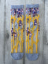 Questi calzini trasparenti alla caviglia sono decorati con un raffinato motivo floreale che richiama la lavanda, ricamato in tonalità viola, rosa e blu con steli gialli a contrasto. La base in tulle trasparente dona leggerezza ed eleganza, mentre punta, tallone e bordo elasticizzato in grigio offrono resistenza e comfort. Perfetti da indossare con sneakers, ballerine o sandali, aggiungono un tocco vivace e romantico ai tuoi outfit quotidiani o primaverili.