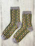 Questi calzini verdi sono impreziositi da un ricamo floreale in giallo e grigio che si sviluppa in file ordinate lungo tutta la trama. I dettagli a contrasto su punta, tallone e polsino in grigio completano il design, rendendoli un accessorio unico e raffinato. Morbidi e confortevoli, sono perfetti per dare un tocco di stile e originalità al tuo look quotidiano.