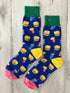 Dai un tocco divertente e goloso al tuo look con questi calzini fantasia fast food! Decorati con hamburger, patatine e bibite su sfondo blu, sono ideali per chi ama uno stile giocoso e originale. Il tallone giallo, la punta rosa e il polsino verde aggiungono un contrasto vivace che rende questi calzini un vero must-have per gli amanti dei dettagli colorati.