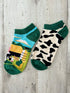 Calzini spaiati con fantasia mucche, ideali per chi ama accessori divertenti e originali. Un calzino raffigura una scena campestre con mucche, fattoria e paesaggio verde, mentre l’altro riprende la tipica stampa bianca e nera a macchie. Realizzati in morbido cotone traspirante, offrono comfort per tutta la giornata. Perfetti per aggiungere un tocco simpatico al tuo outfit quotidiano o come idea regalo unica per chi ama la natura e lo stile giocoso, questi calzini uniscono qualità, comodità e fantasia campestre.