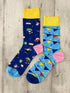 Calzini spaiati allegri e colorati con fantasie a tema festa e compleanno, ideali per chi ama accessori unici e pieni di energia. Un paio vivace che combina bandierine, coriandoli, regali e personaggi festosi, con colori brillanti come blu, giallo, rosa e azzurro. Realizzati in cotone morbido e traspirante, offrono comfort per l’uso quotidiano. Questi calzini divertenti sono perfetti come idea regalo per compleanni o per chi vuole portare un tocco di festa e buonumore al proprio look di ogni giorno.