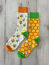 Calzini spaiati divertenti e originali con fantasie di api e fiori da un lato e alveare a nido d’ape dall’altro. Un design vivace e colorato con dettagli arancio, verde e giallo, ideale per portare un tocco di allegria al tuo look quotidiano. Realizzati in cotone morbido e traspirante, offrono comfort per tutto il giorno. Perfetti come idea regalo creativa per chi ama la natura, le api e gli accessori originali.