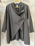 Giacca asimmetrica in tessuto morbido, dal design moderno e raffinato. Caratterizzata da un ampio collo drappeggiato e una chiusura laterale con bottoni, può essere indossata aperta o chiusa per creare diversi effetti di stile. La linea svasata e fluida valorizza la silhouette offrendo comfort e libertà di movimento. Perfetta per look contemporanei e ricercati, è ideale da abbinare a pantaloni o abiti per un outfit elegante ma rilassato. Un capo versatile che unisce originalità e praticità