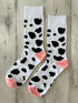 Calzini divertenti e originali con stampa mucca, caratterizzati da fondo bianco con macchie nere irregolari e dettagli rosa su punta e tallone. Realizzati in cotone morbido e traspirante, garantiscono comfort per l’uso quotidiano. Perfetti per chi ama accessori simpatici e fuori dal comune, questi calzini a tema mucca sono anche un’idea regalo allegra e creativa per amici e amanti degli animali.