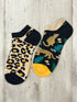 Un mix selvaggio e di carattere per i tuoi piedi. Questi calzini spaiati uniscono il fascino animalier a un design originale: un calzino presenta una stampa maculata in stile leopardato, mentre l’altro raffigura eleganti ghepardi tra foglie tropicali su sfondo nero. I dettagli giallo oro e verde smeraldo aggiungono un tocco vivace e moderno. Realizzati in morbido cotone elasticizzato, garantiscono comfort e sono perfetti per chi ama distinguersi con uno stile deciso e originale.