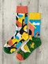 Aggiungi un tocco campestre e allegro al tuo look con questi calzini spaiati a tema anatre e paperelle. Un calzino raffigura un vivace gruppo di anatre dai colori brillanti, mentre l’altro mostra un cortile rurale con pulcini, papere e un piccolo pollaio. Le tonalità vivaci di giallo, verde, arancione e blu rendono questo accessorio fresco e originale.