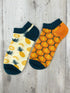 Esotici e divertenti, questi calzini spaiati portano l’energia tropicale direttamente ai tuoi piedi. Un calzino è decorato con ananas interi e a fette su sfondo chiaro, mentre l’altro riprende la texture della buccia con un pattern geometrico arancione e giallo. I dettagli in verde petrolio aggiungono contrasto e carattere, rendendo il design ancora più originale. Realizzati in morbido cotone elasticizzato, offrono comfort e traspirabilità, perfetti per chi ama distinguersi con uno stile fresco e fruttato.