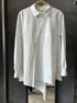 Camicia bianca asimmetrica in cotone dal design contemporaneo e raffinato. Caratterizzata da una chiusura a mezza abbottonatura con bottoni tono su tono e da un colletto classico, si distingue per il taglio irregolare sul davanti che dona movimento e originalità al look. La tasca applicata sul petto aggiunge un dettaglio moderno, mentre le maniche lunghe con polsino abbottonato mantengono un’eleganza senza tempo. La vestibilità è morbida e scivolata, pensata per chi cerca un capo versatile e sofisticato da indossare sia con jeans casual che con pantaloni sartoriali.