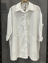 Camicia oversize donna a maniche lunghe realizzata in cotone leggero, disponibile nei colori bianco e nero. Caratterizzata da una linea ampia e rilassata, con taglio orizzontale in vita che aggiunge un dettaglio sartoriale e moderno. Presenta colletto classico, chiusura frontale con bottoni e maniche arrotolabili per uno stile casual ma raffinato. Perfetta da indossare come camicia o come leggero soprabito, abbinata a jeans, pantaloni eleganti o leggings per un look minimal e contemporaneo. Adatta per ogni stagione grazie alla sua versatilità e comfort.